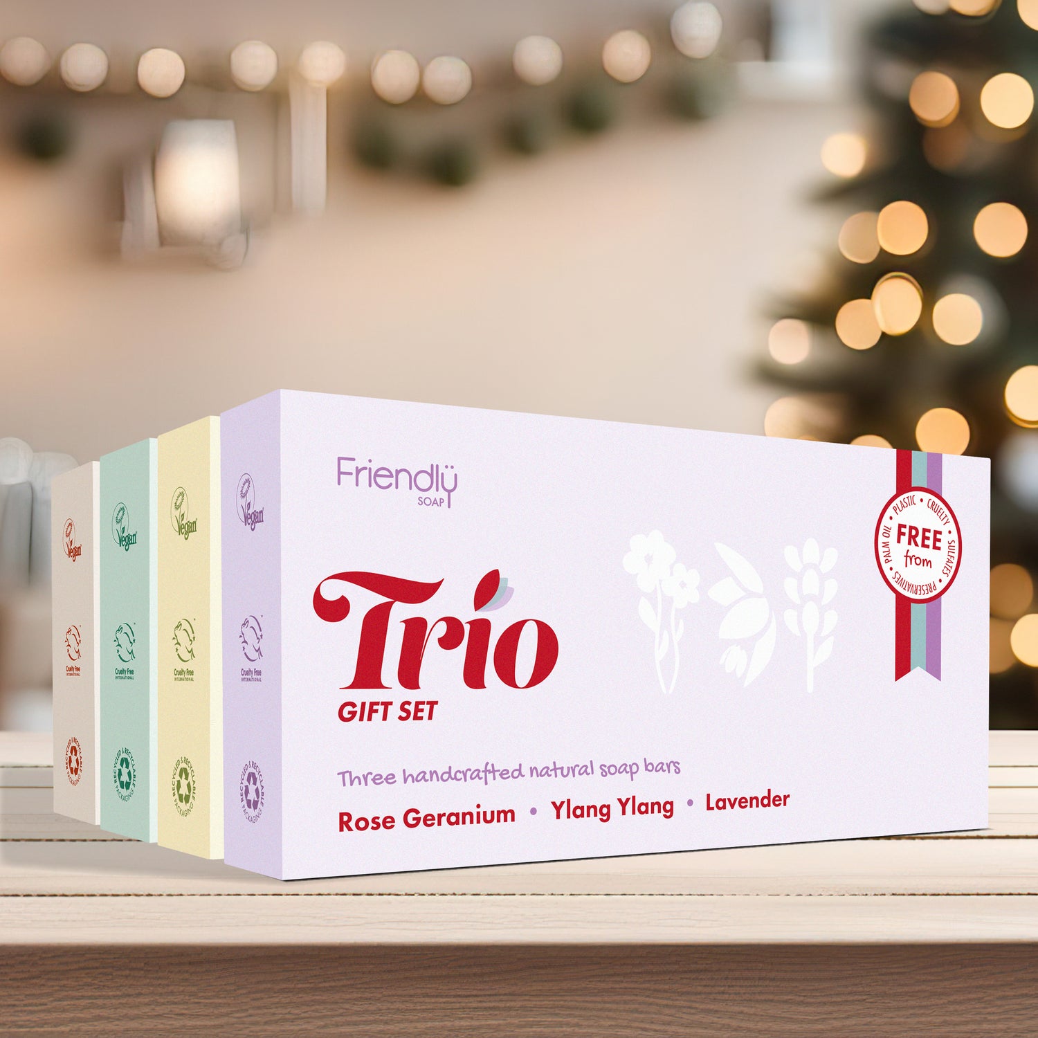 Four gift sets each containing a trio of handcrafted natural soap bars. Cruelty free, plastic free, ethical and perfect for gifting.